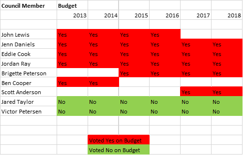 Here are the voting records for the town budget. We’ve listed examples of some of the votes related to large amounts of spending.