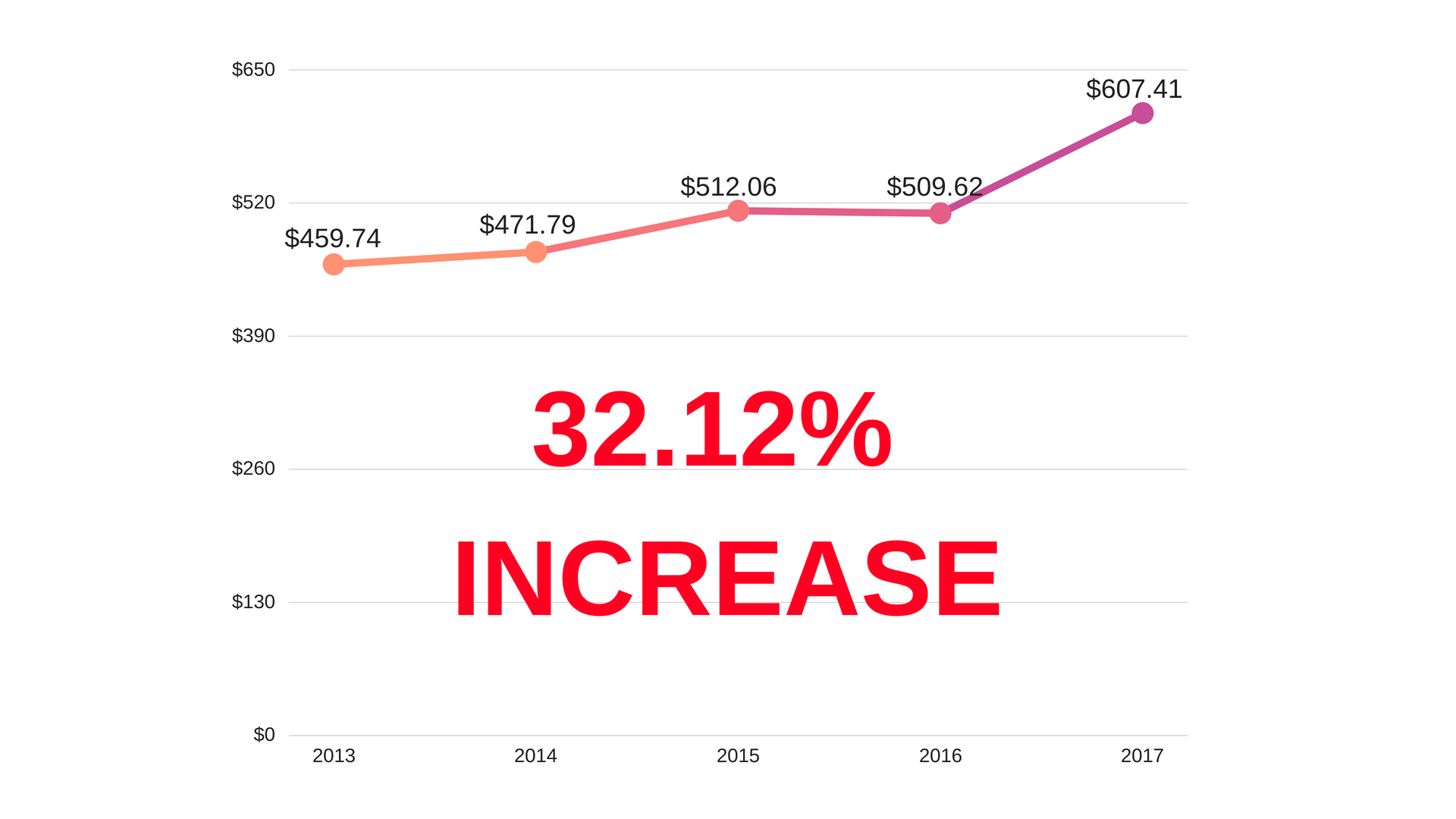 In 2013 the amount of spending per citizen was $459.74. In 2017 that amount grew to $607.42 per citizen.